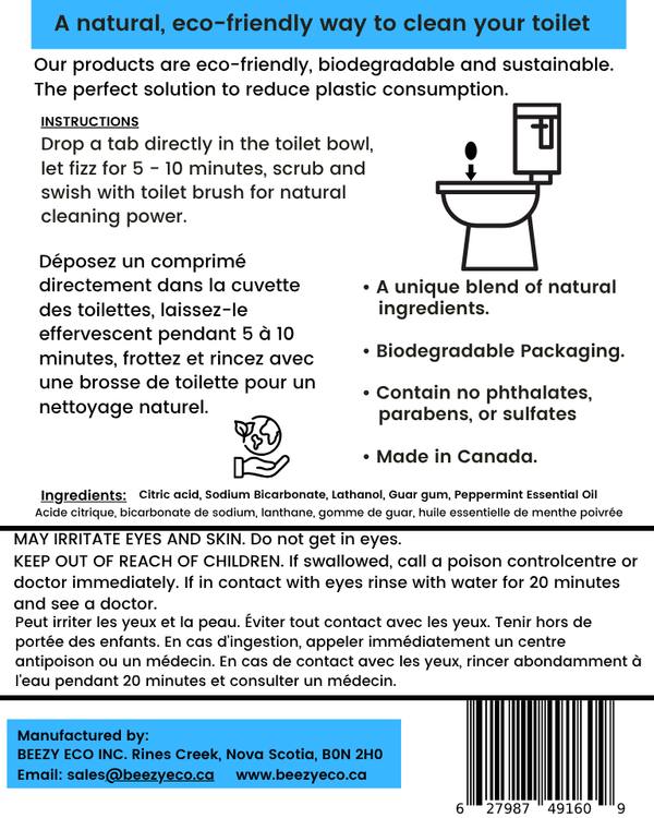 Beezy Eco’s Toilet Bowl Cleaner Tablets are an eco-friendly, septic safe and plastic free cleaning solution for your toilet.